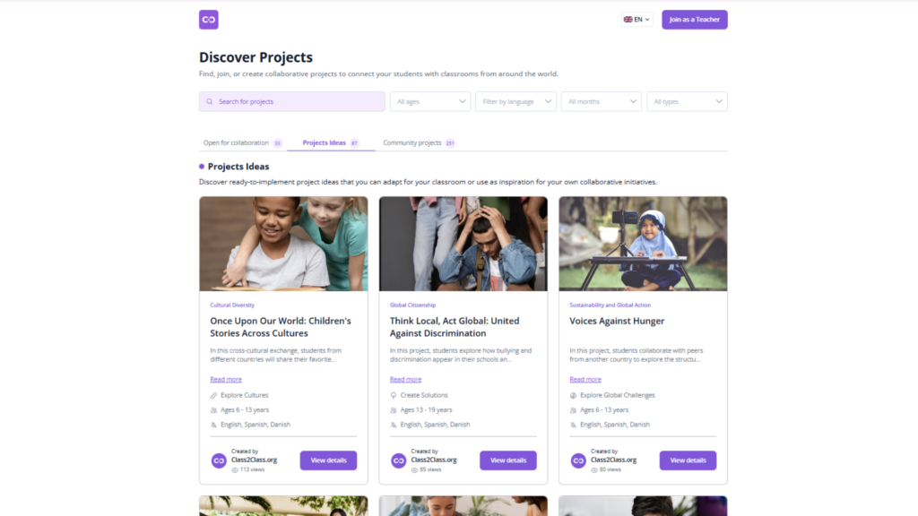Think about what works for your students right now—their age level, interests, curriculum connections, and your available time. Project Ideas cover diverse themes, from cultural exchange to environmental investigation to creative collaboration, so you will find options that align with your teaching goals.