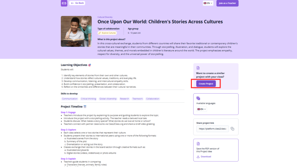 When you open a Project Idea on Class2Class, you find everything needed to understand, plan, and implement the collaboration. Here you will find:Project Description and Context