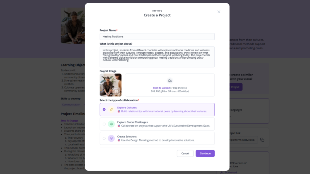 The system helps you turn the general framework into your specific project. You provide details about your classroom, specify what you are looking for in a partner teacher, and adjust the timeline or activities to fit your teaching context.