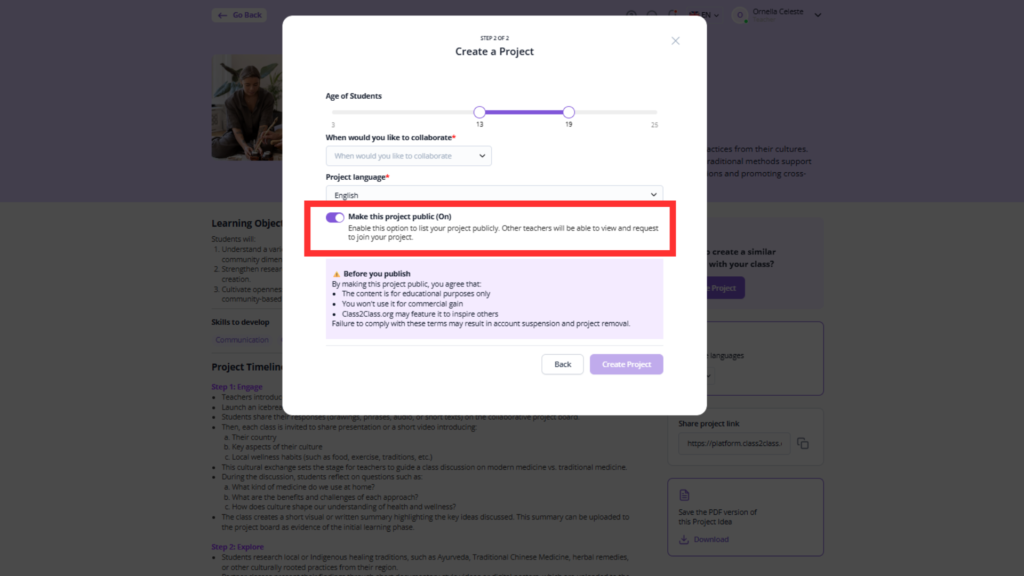 This makes your project visible to other teachers looking for classroom collaboration opportunities. Teachers searching for projects that match their goals, timeline, and student characteristics can find yours and request to join.
