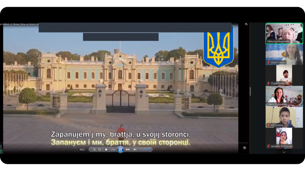Argentine students practiced Ukrainian words live on the call — pryvet (hello) and dyakuyu (thank you) — repeating after their peers in a moment that was warm and genuinely fun. The session closed with a Kahoot game both classes played together.